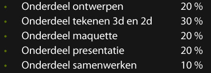 Het project wordt op een heel aantal punten beoordeeld. De onderdelen waarop beoordeelt wordt, tellen echter niet allemaal even zwaar mee. Hieronder volgt een opsomming van de beoordeling met de waarde die aan ieder onderdeel gehecht wordt.